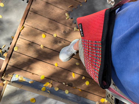 Our newest bag, the GoGo , is the perfect companion for your next adventure. This compact 8"x6" bag is the ideal size for carrying your essentials, from keys and phone to sunglasses and lipstick. Made from a red yoga mat mixed with a beautiful home decor print fabric with lots of other colors to compliment any outfit-we repurpose them into our beautiful, functional and cool bags:)