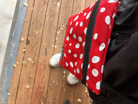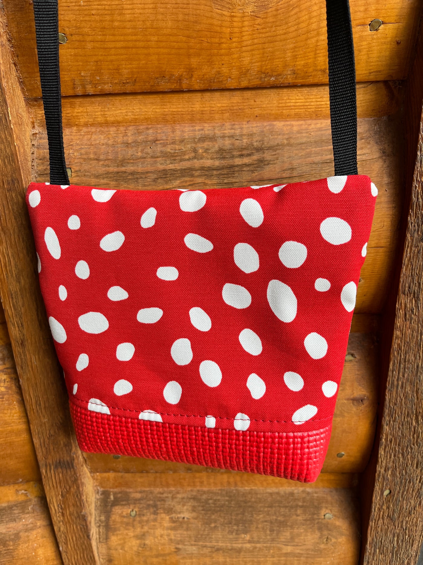 The Red Lola cross body purse is the perfect way to keep your essentials close at hand. This purse is made from new repurposed materials, mostly yoga mat scraps, and features a lined interior pocket and an adjustable shoulder strap. It's the perfect size to hold your phone, wallet, keys, and other small items.