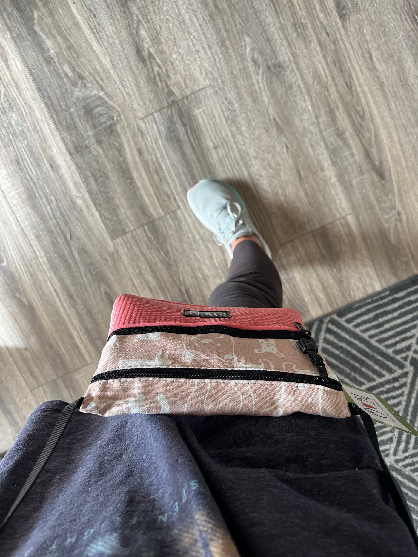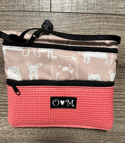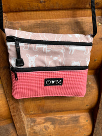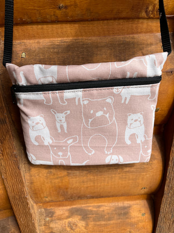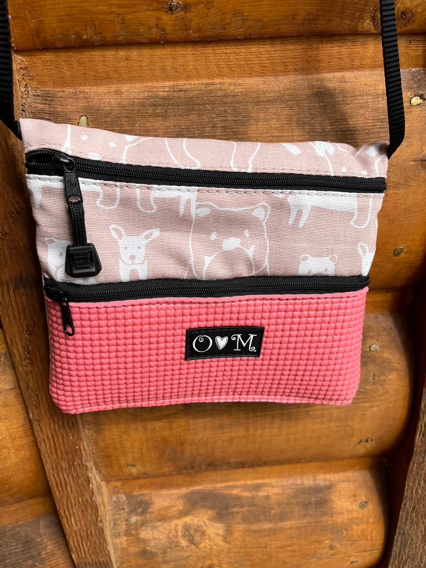 Playful dog print fabric meets functional design in this handmade cross-body purse. Crafted in Colorado with premium USA-made materials, this bag features a vibrant coral yoga mat bottom for durability and comfort. Multiple zippered compartments keep your essentials organized and secure. Perfect for everyday carry with a touch of personality.