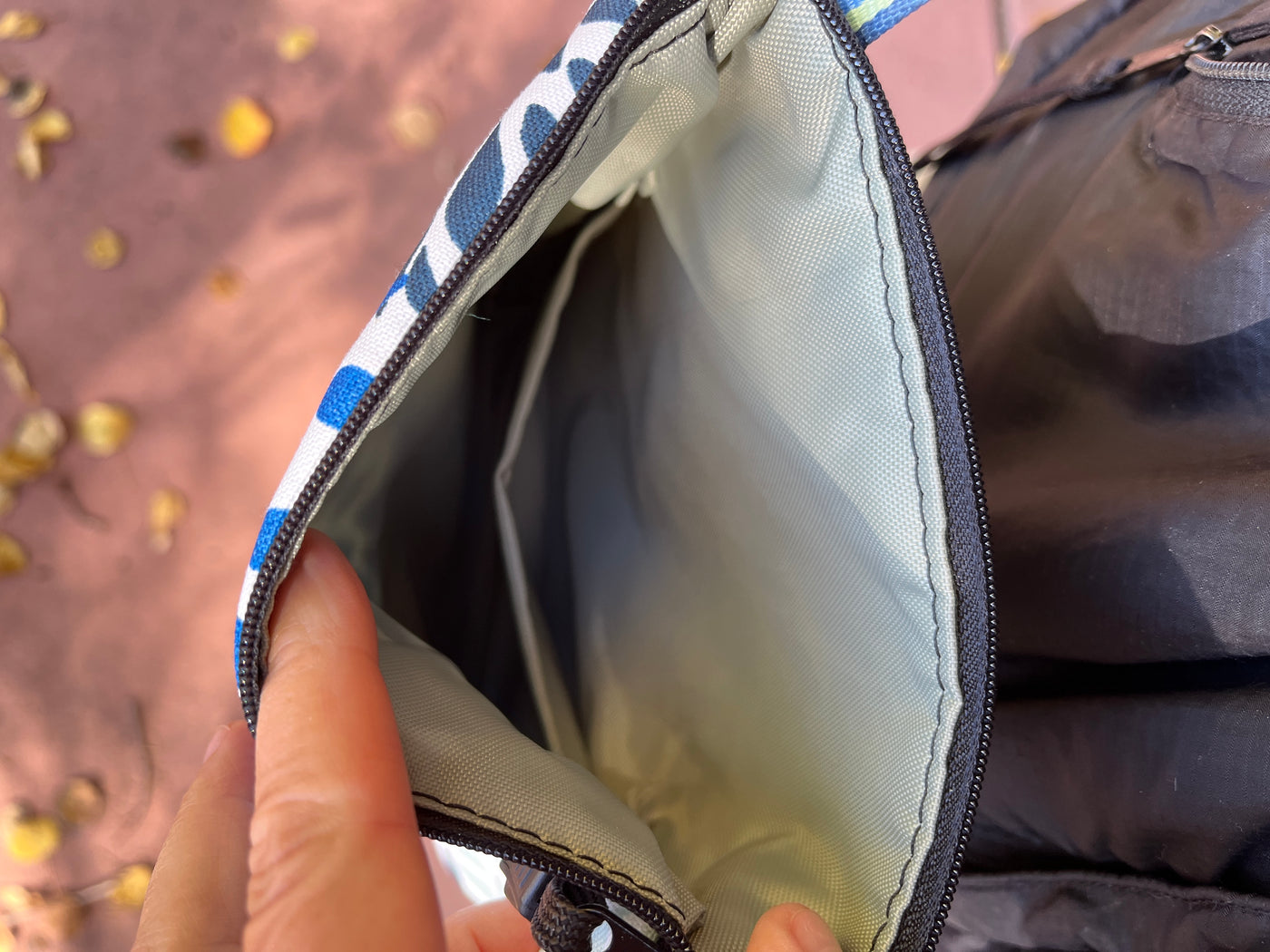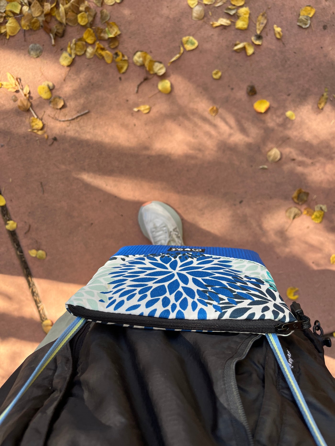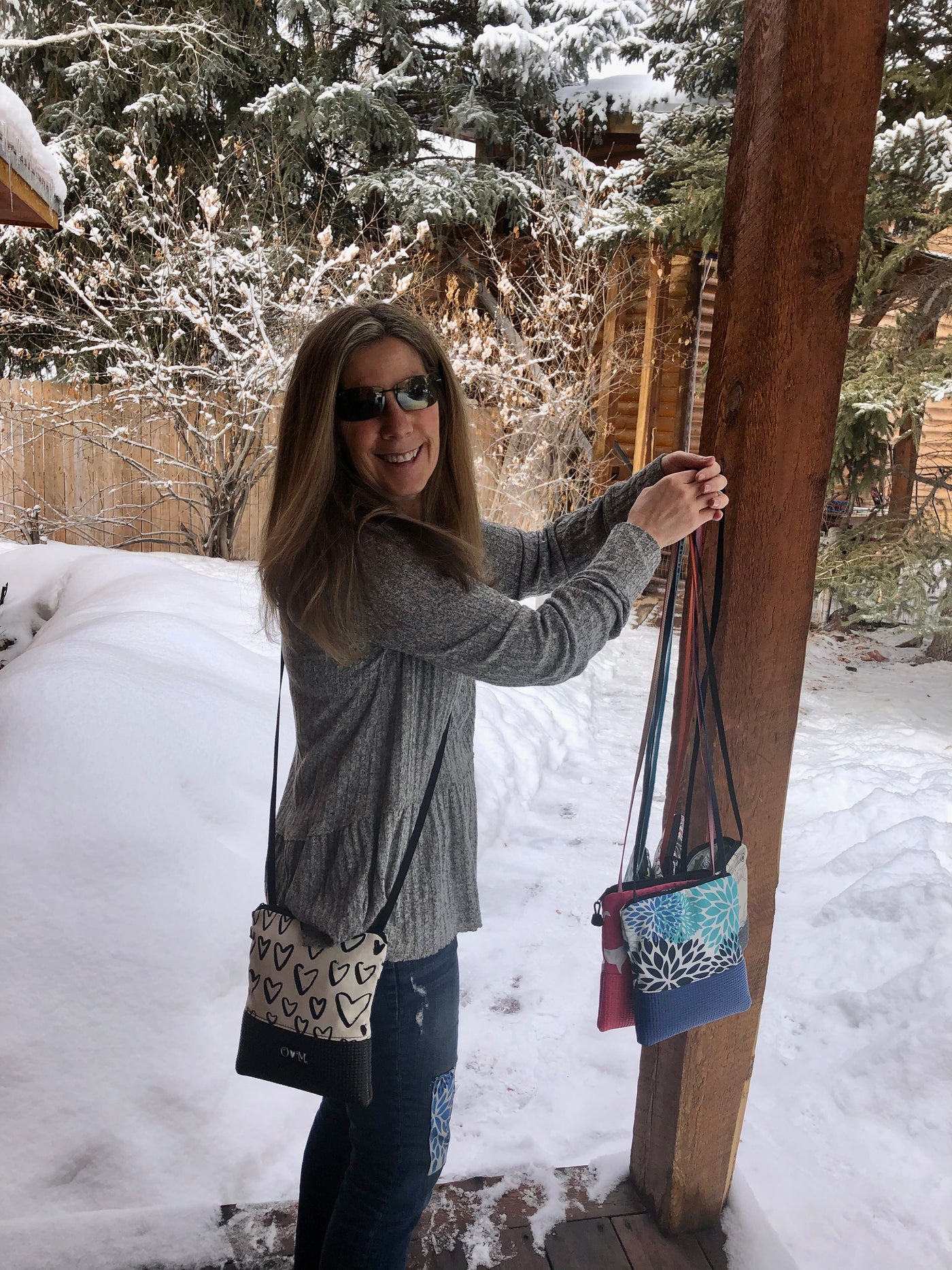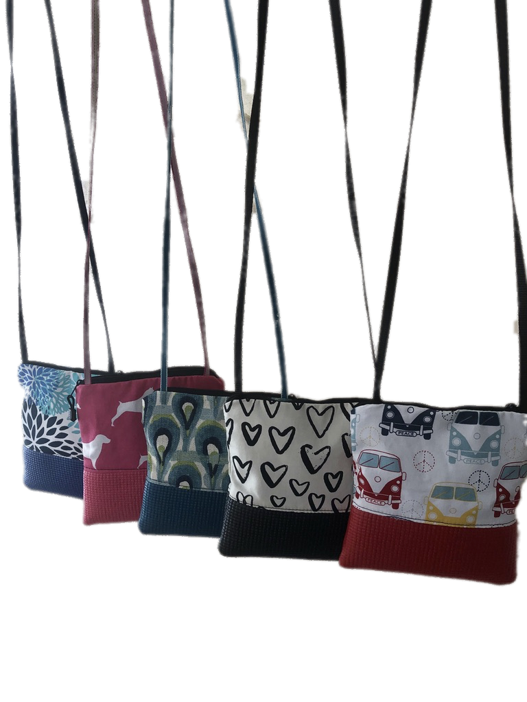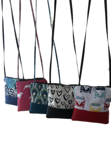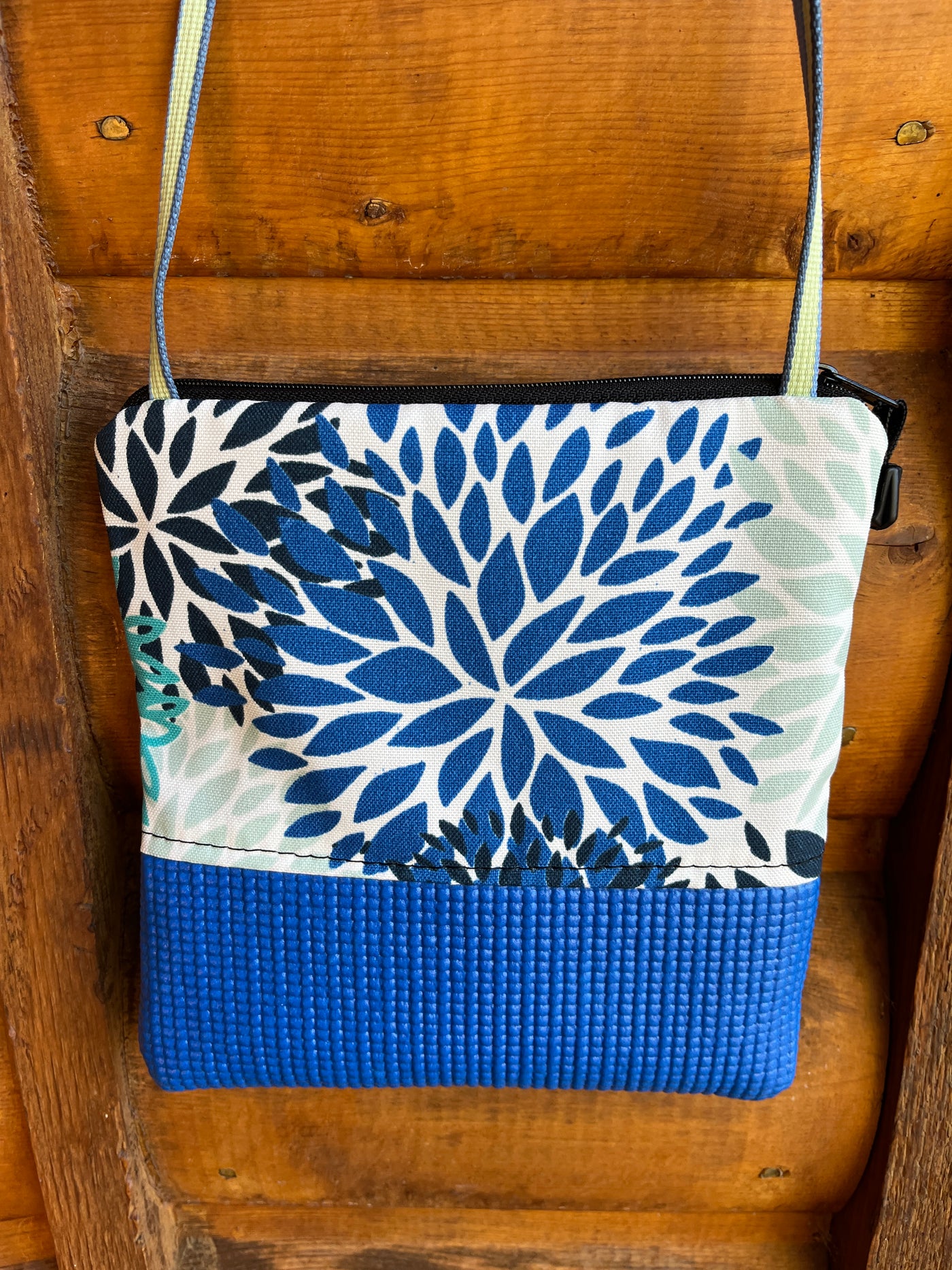 The Stella is one of our new cross-body purses. We used yoga mat material for the bottom of the bag and mixed it with USA made fabric ontop. We re-purpose new yoga mats along with sandal webbing for our shoulder straps. 8x8 in size