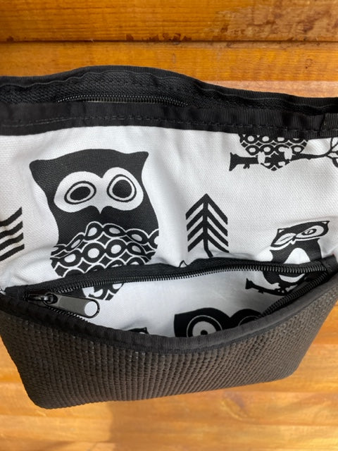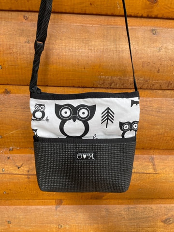 The OLovesM black crossbody purse with the owl print fabric is called the Bernie. It's a great everyday purse or for travel. Measuring 9x10x2 with a sturdy crossbody shoulder strap.
