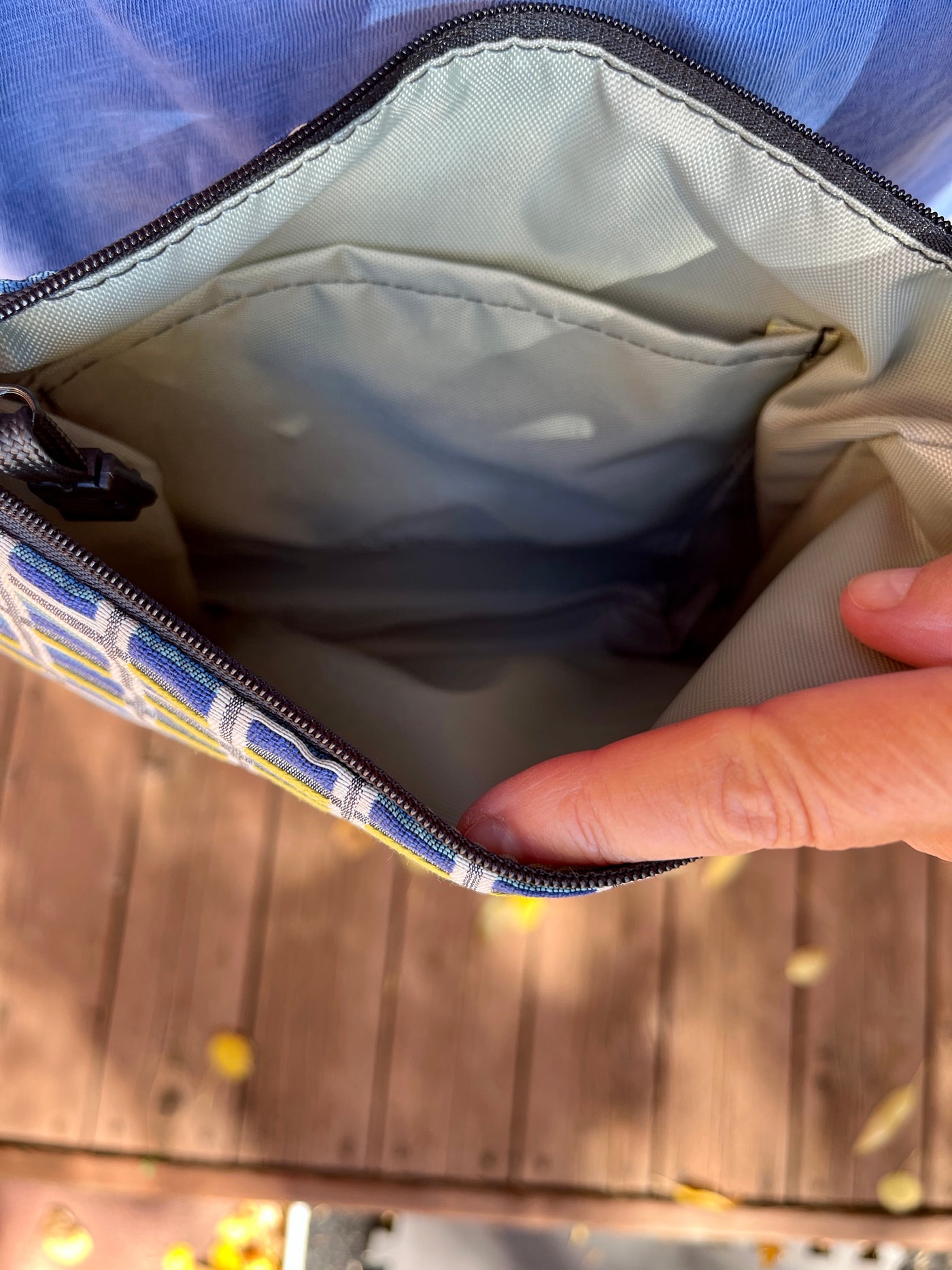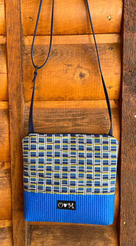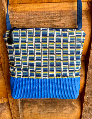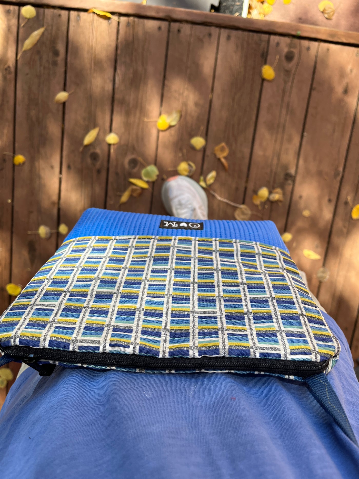This one-of-a-kind bag pairs a comfy blue yoga mat base with eye-catching geometric print home decor fabric—because why should your accessories be boring?