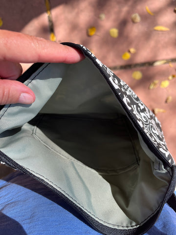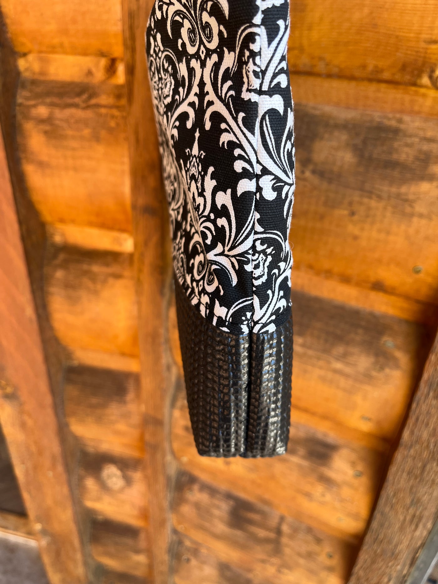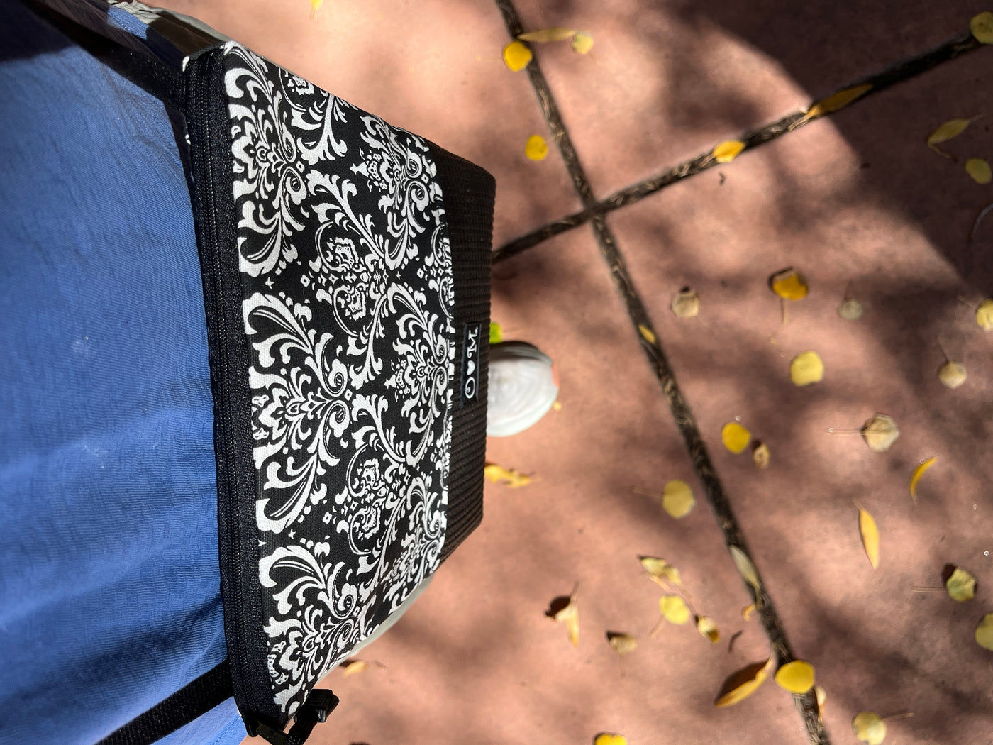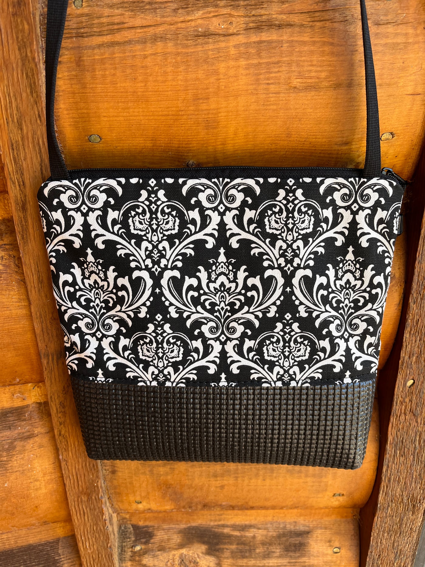 OLovesM Rose purse in black yoga mat bottom, with a USA made cotton print damask fabric, is a stunning fusion of function and eco-consciousness!